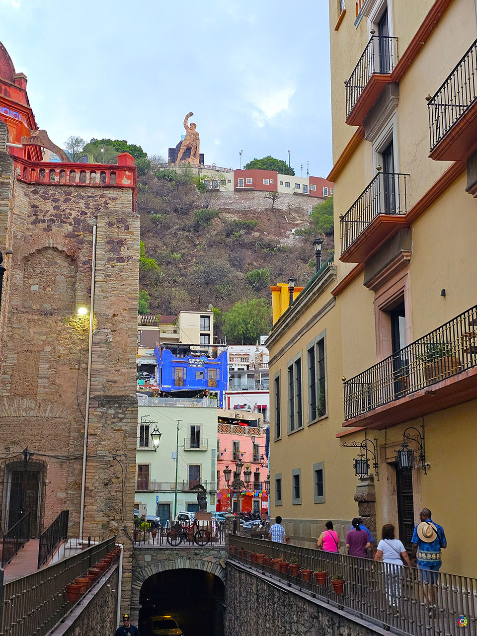 Desde la calle del lateral del Templo de San Diego podrás ver en lo alto una gran escultura. Se trata del Monumento al Pípila. Se ubica en lo alto del cerro de San Miguel, dominando el paisaje de Guanajuato, se trata de uno de los símbolos más poderosos de la ciudad. Más que una escultura, es un homenaje eterno a la valentía de un pueblo minero que luchó con determinación por la independencia de México.