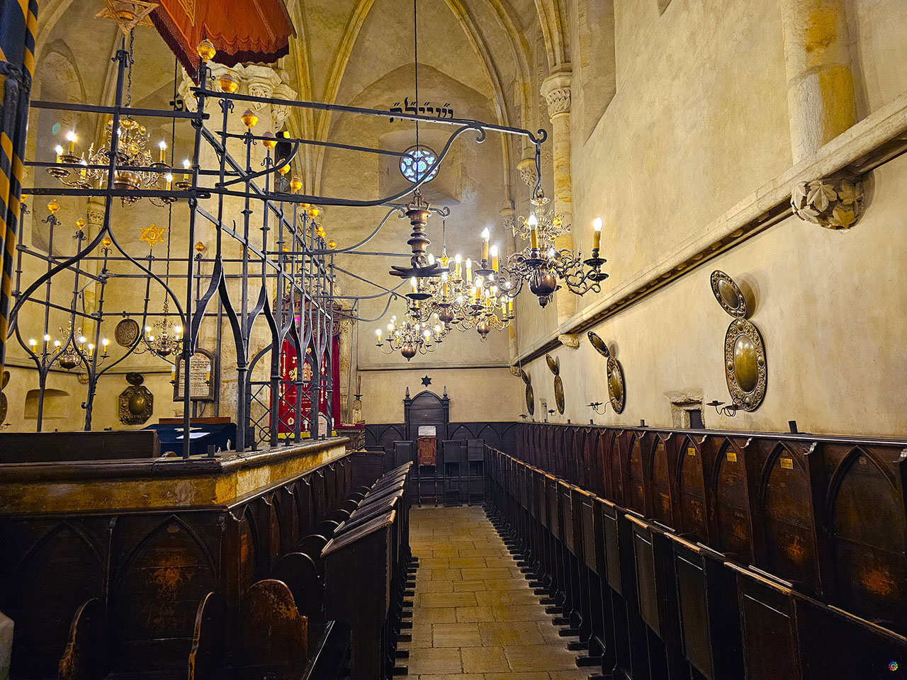 Aquí es donde uno encara el pasado de frente. Es una de las sinagogas medievales más antiguas que continúa en funcionamiento. Su estructura gótica, su atmósfera interior apenas alterada, invita al recogimiento. Al entrar, observa la bóveda, la distribución del espacio, la bimá (el lugar desde donde se dirige el culto), y esa mezcla entre lo recogido y lo monumental. También presta atención a las piedras exteriores: ventanas, contrafuertes, detalles en las tallas que, con el tiempo, han ganado pátina. Está incluida en la Prague Visitor Pass.