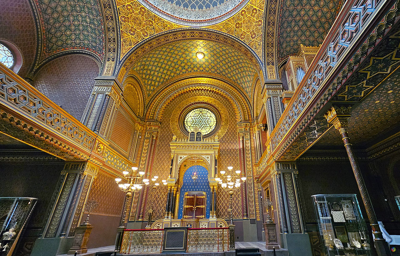 Visualmente, esta sinagoga impresiona por su estética decorativa. Los interiores tienen una ornamentación que remite a estilos moriscos, arabescos, coloridos detalles que contrastan con la sobriedad gótica de otras sinagogas del barrio. Pero no es solo belleza: también funciona como espacio de exposición, donde se muestra parte del patrimonio del pueblo judío, rituales, objetos, libros, manuscritos. Es un puente entre lo espiritual, lo cultural y lo artístico. Está incluida en la Prague Visitor Pass.