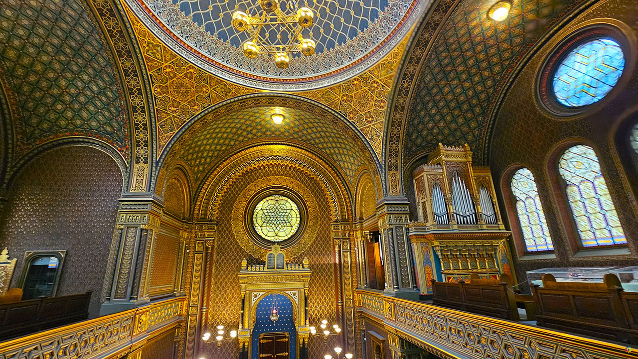 Originalmente llamada Sinagoga del Jubileo en honor al emperador Francisco José I, solo interrumpió sus servicios durante la ocupación nazi. Su interior, repleto de ornamentación y colores vivos, acoge una exposición permanente sobre la comunidad judía de Praga desde 1945 y otras muestras temporales.