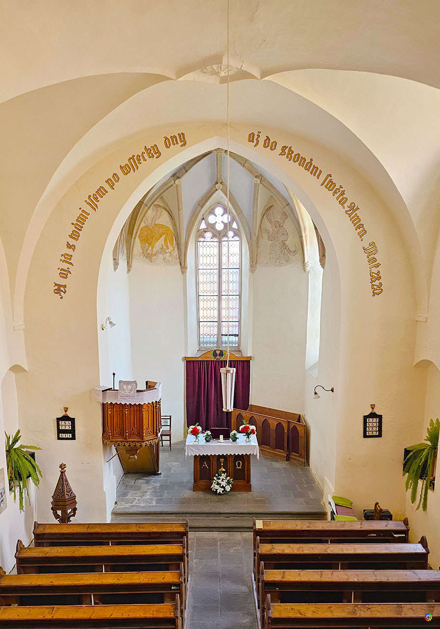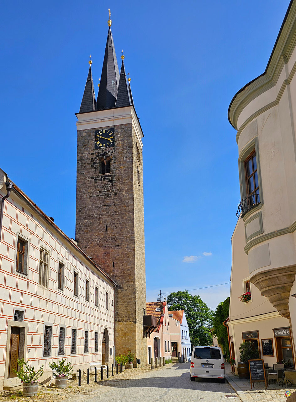 Se trata de la construcción más antigua de Telč, siglo XIII, aunque no se sabe con exactitud quien y cuando la construyó. Con 50 metros de altura, su función era la vigilancia del cruce de las rutas comerciales y como refugio en caso de peligro. Alberga en su parte baja una pequeña iglesia. Si te animas a subir hasta la cima , desde allí verás una panorámica de Telč. Aunque la verás a través de una reja de protección. La verdad es que las vistas, aunque son preciosas, no son muy amplias y para hacer fotos con la reja de por medio, bastante complicado. Si no estás por la labor de subir muchas escaleras, te recomiendo la otra torre desde la que las vistas son realmente impresionantes.