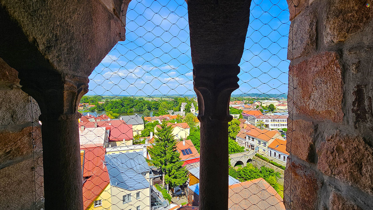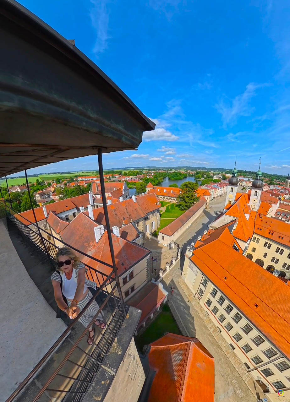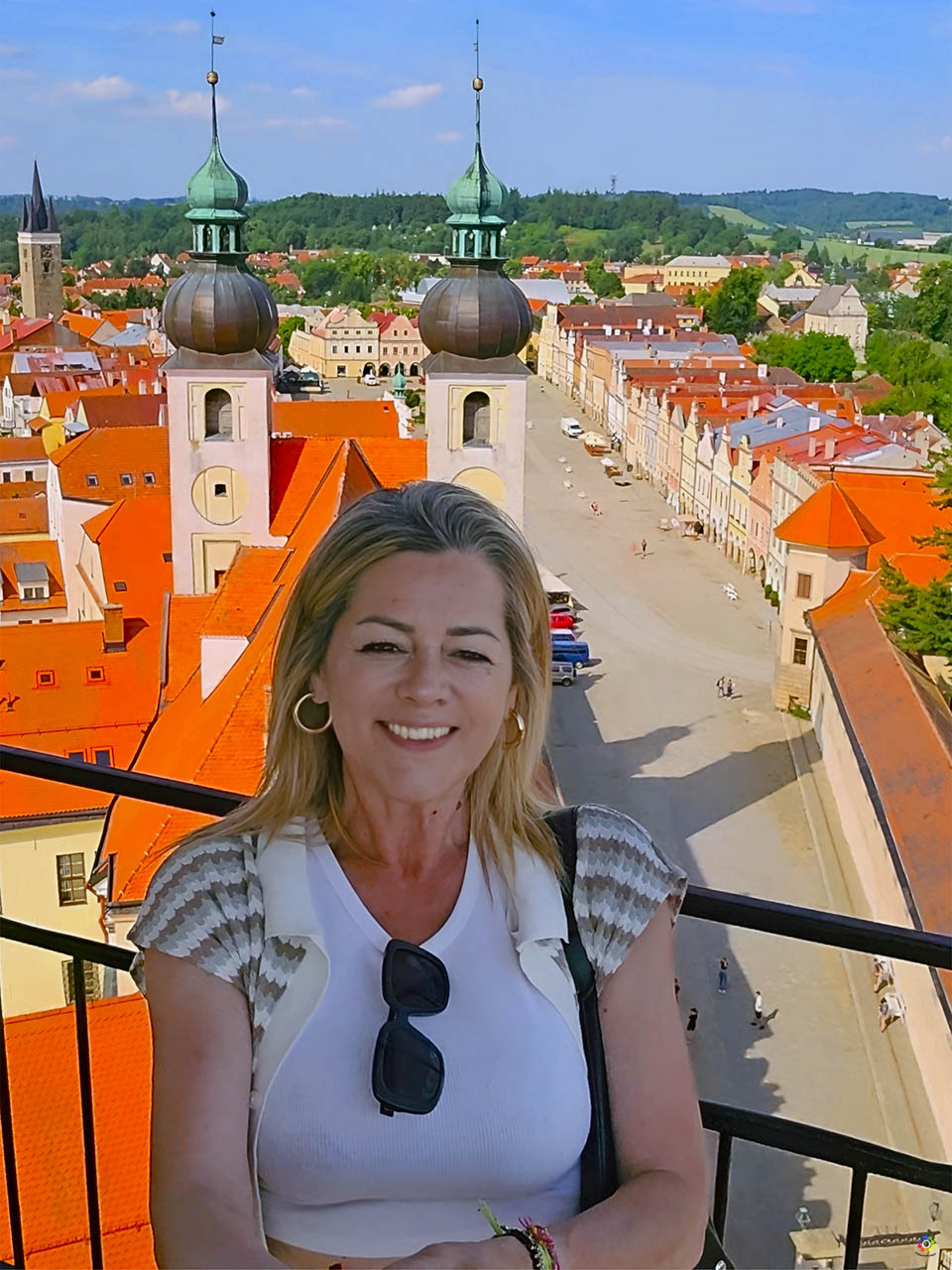 Ubicada justo en frente de la del Espíritu Santo, al otro lado de la Plaza y en frente al Palacio, esta es la Torre que no te puedes perder en tu visita a Telč . Son más de 150 escalones, que se van estrechando a medida que subes, llegas hasta el campanario y debes pasar por debajo de las campanas para continuar la subida, no es fácil y si no estás en buena forma, tienes problemas de movilidad o de corazón, te aconsejo no subir. Pero si estás en condiciones de hacerlo, te aseguro que lo que te encontrarás en la parte superior no tiene precio. Un pequeño balcón que rodea la Torre y que te permite ver una panorámica completa de Telč y los lagos que la rodean como si de un cuadro se tratase. En cuanto a la visita tiene un precio de 45 coronas checas, lo que vendría siendo 1,81€ pero debes llevar dinero en moneda local para pagar porque solo aceptan efectivo. Debes tener en cuenta también el horario, cuando fuimos nosotros casi nos la perdemos porque a las 17:00 cierran por lo que deberás subir como muy tarde a las 16:30.