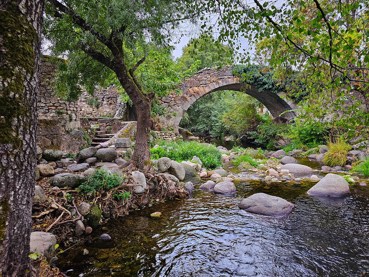 Otra parte del grupo nos dirigimos a Aldeanueva, participamos en la ruta “Los Chascarrillos de Marce – Forillo”, donde nos contaron historias y anécdotas sobre el antiguo tren y la vida en la dehesa. Situada en el centro de la comarca, esta villa conserva el trazado de la antigua Vía de la Plata, que atraviesa su calle principal. Aún pueden verse restos de la calzada romana y un precioso puente romano sobre el río Ambroz, imprescindible para los amantes de la fotografía y la historia.