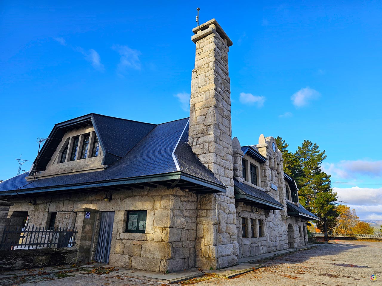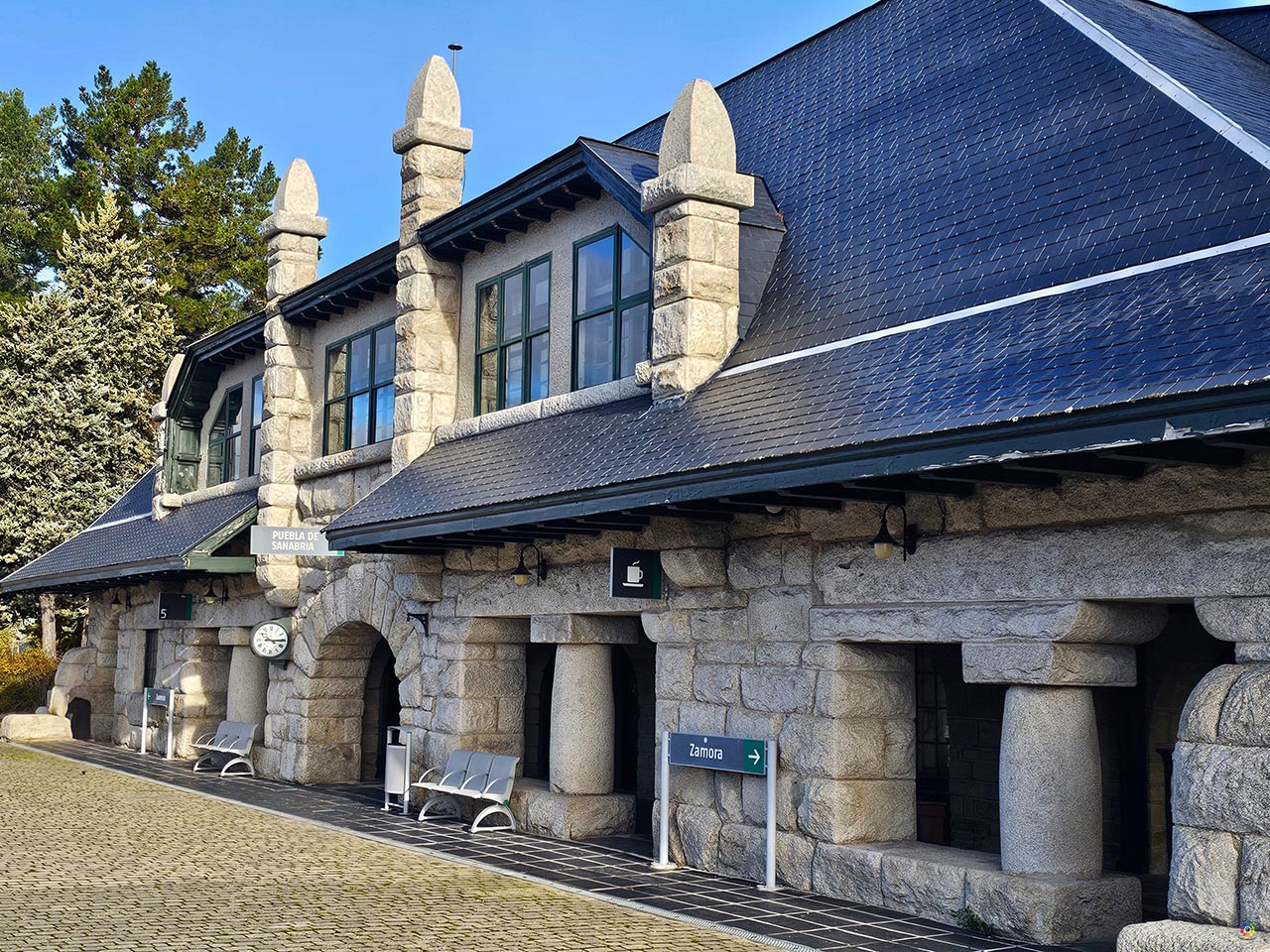 Su edificio de piedra llama la atención nada más llegar. Construida con enormes sillares y rematada con esos tejados de pizarra que se integran tan bien en el paisaje sanabrés, la estación parece más una casona tradicional que un espacio ferroviario. Incluso los detalles : arcos, molduras, ventanas simétricas, están cuidados al milímetro, convirtiéndola en una pieza única dentro del patrimonio local. No es grande, pero está muy bien distribuida: taquilla, sala de espera, servicios… y andenes que se abren paso hacia un entorno natural que casi parece un decorado de película. En épocas tuvo cafetería, aunque en la actualidad no funciona.