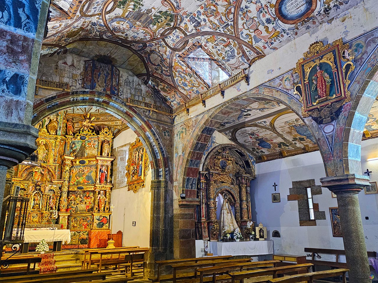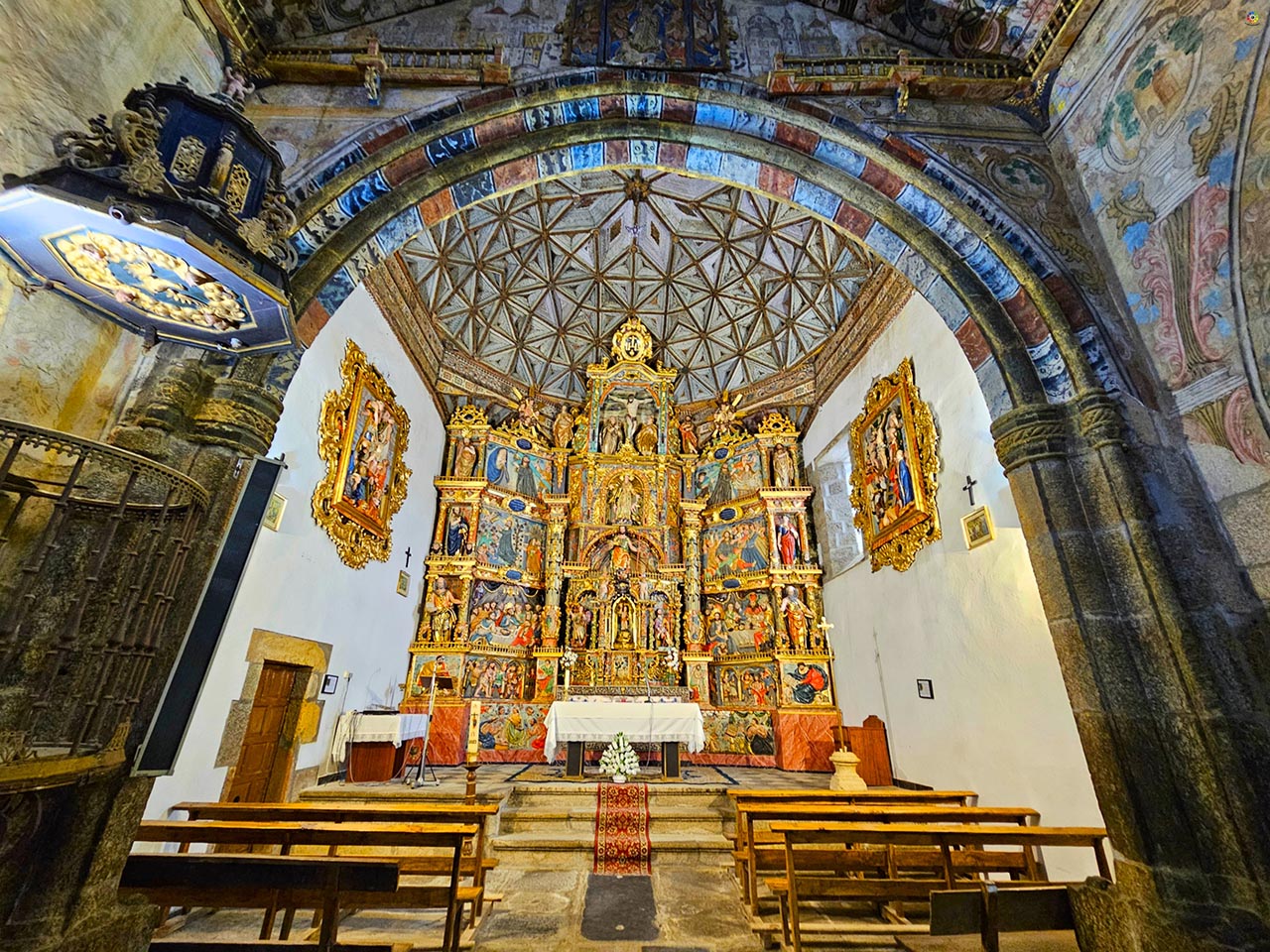 Las pinturas que decoran prácticamente todo el templo fueron realizadas en 1773 por Petrus Sopeña, un trabajo minucioso que mezcla motivos vegetales, animales, paisajes imaginarios, castillos y ciudades idealizadas. Esa mezcla de ingenuidad y detalle convierte la visita en un recorrido visual fascinante. El retablo mayor, renacentista y policromado, completa el conjunto: un impresionante panel de 63 metros cuadrados rematado por un Calvario y flanqueado por bajorrelieves que representan La Lanzada y el Descendimiento. Sobre el sagrario barroco se sitúa la imagen del santo titular.