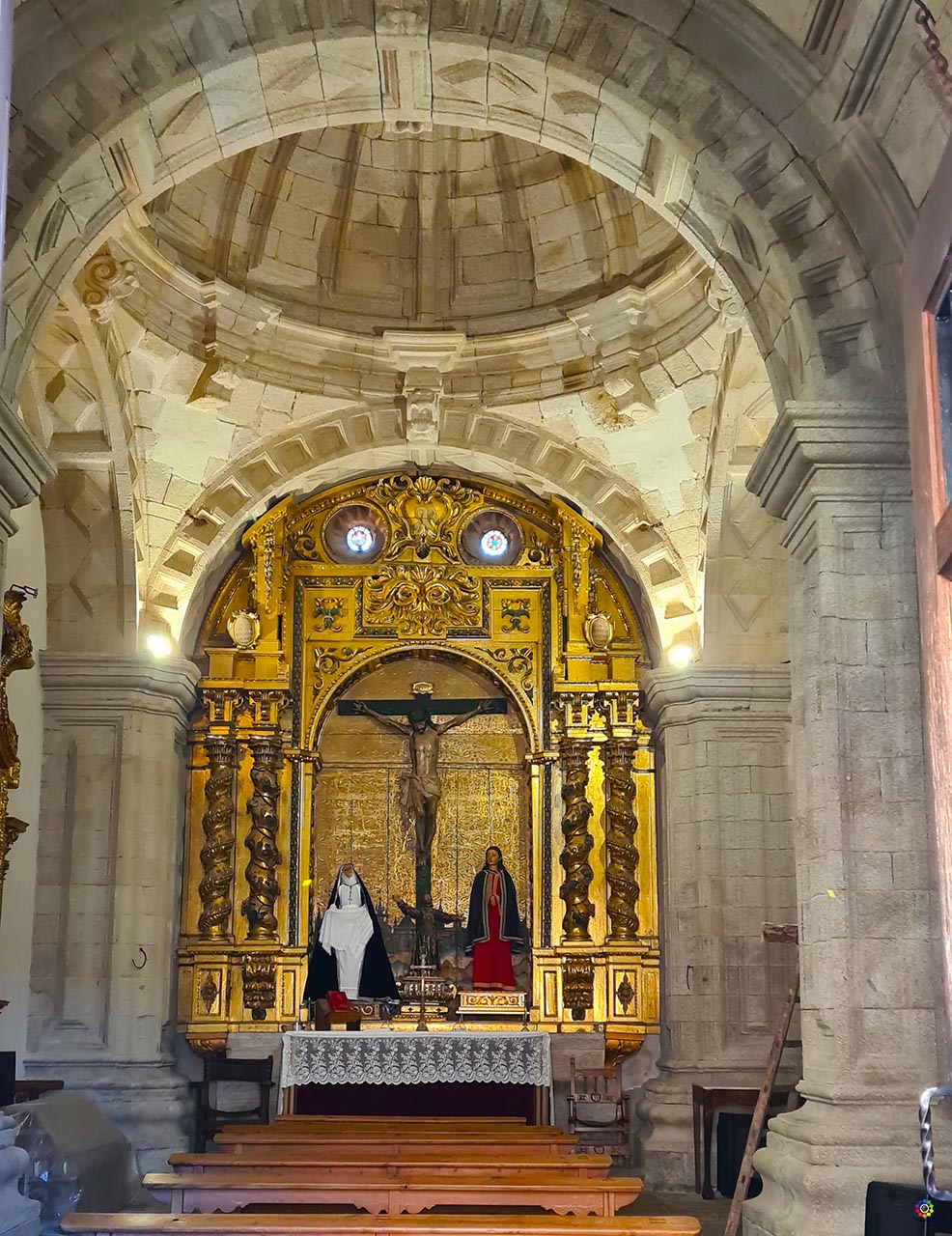 Este sacerdote mandó construir la ermita como capilla de enterramiento para su linaje, y en cuanto se entra se entiende por qué quiso un espacio íntimo y recogido. El interior es muy reducido, formado por una sola nave cubierta con una bóveda de cañón casetonada en granito, que aporta una sensación de solidez y serenidad. Frente al altar, una pequeña cúpula sobre pechinas suaviza el conjunto y deja pasar una luz tranquila. A ambos lados se conservan los enterramientos familiares, incluido el del propio fundador a la derecha.