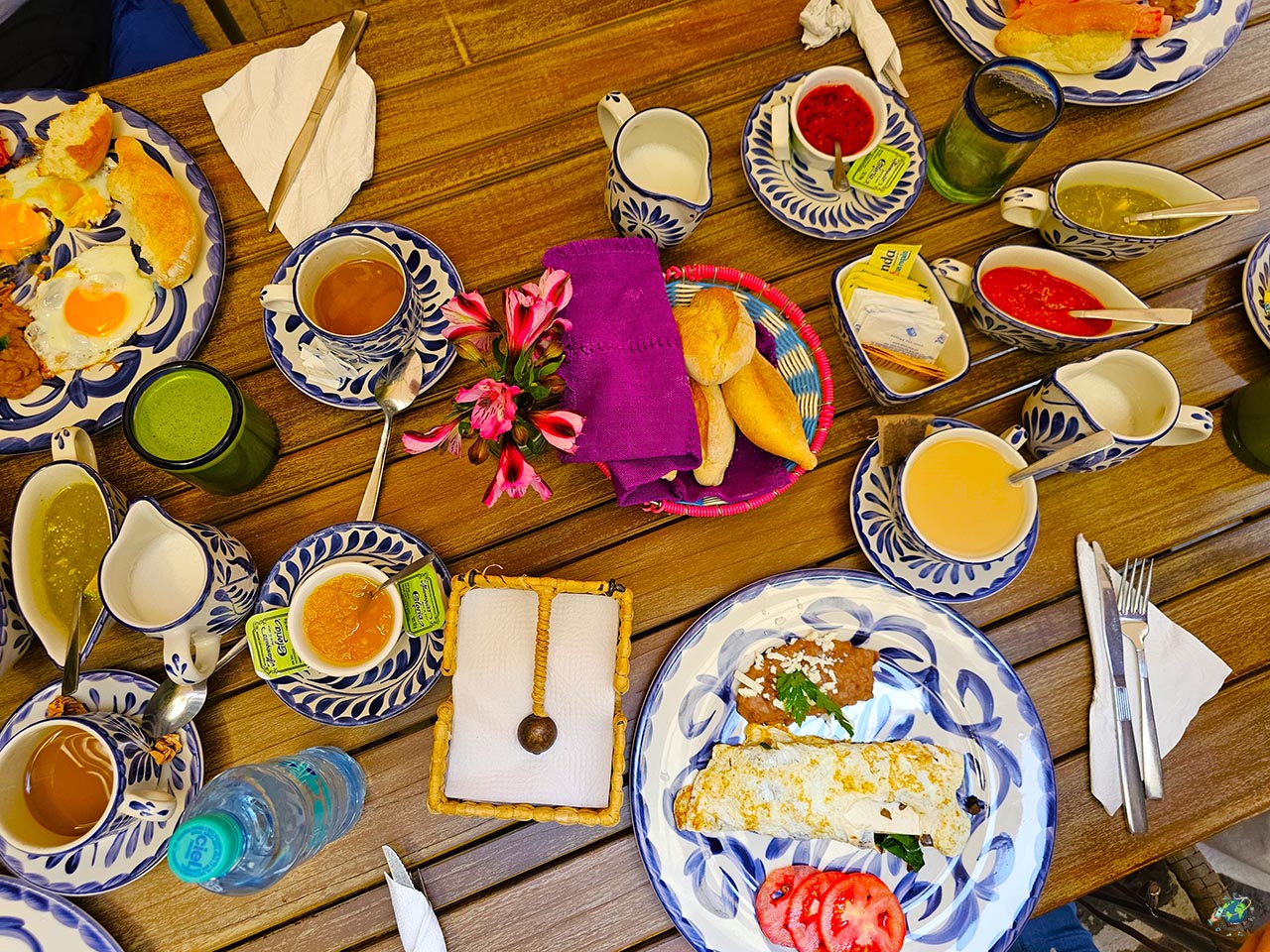 Nosotros desayunamos dos días: Uno en el patio central que para empezar el día, y fue todo un acierto. Un espacio tranquilo, luminoso y con ese aire colonial que encaja perfectamente con el ritmo pausado de la mañana en San Miguel. Ideal para sentarse sin prisas, disfrutar del café y planear la jornada. Y otro en la zona que da a la calle.