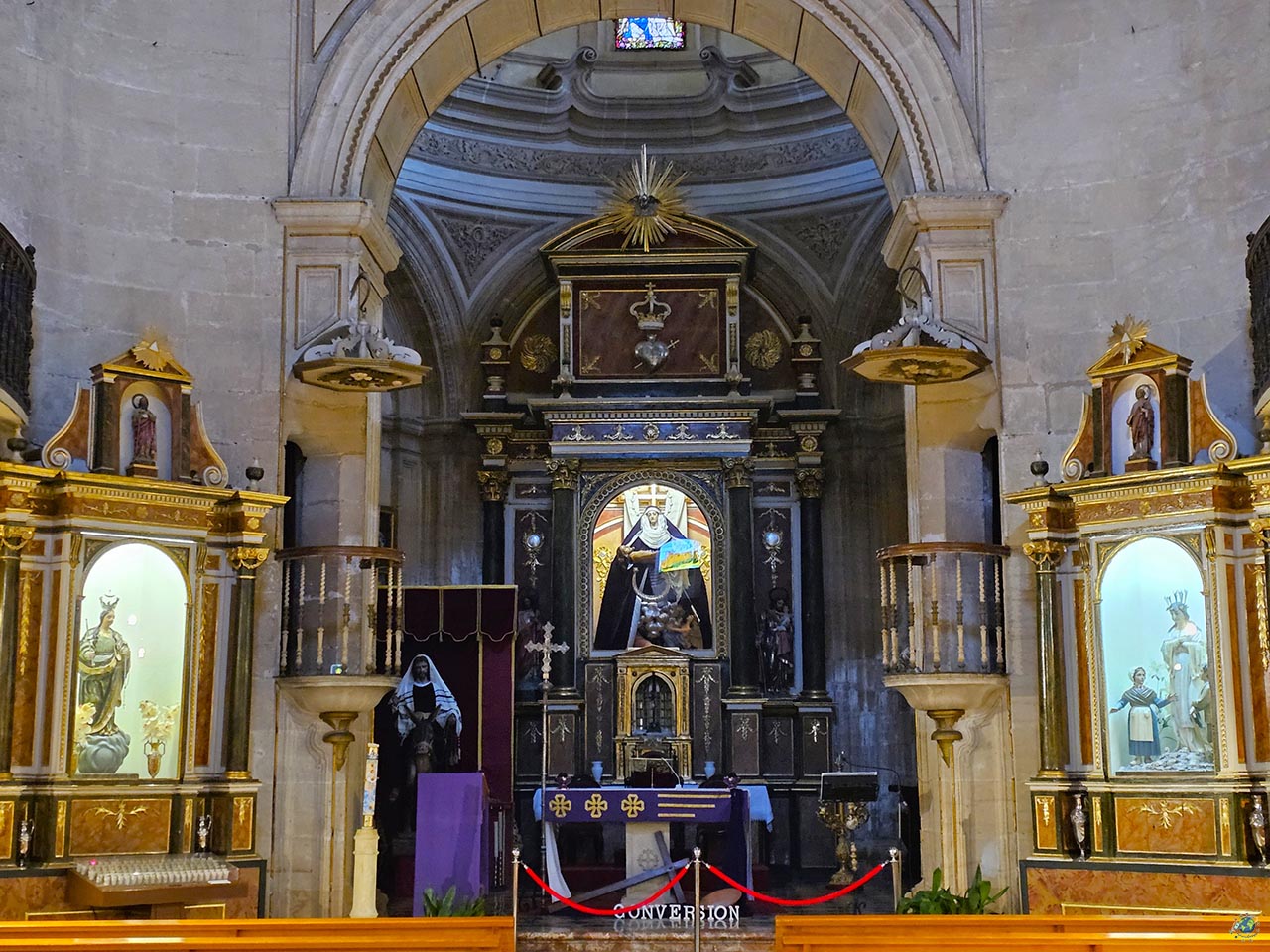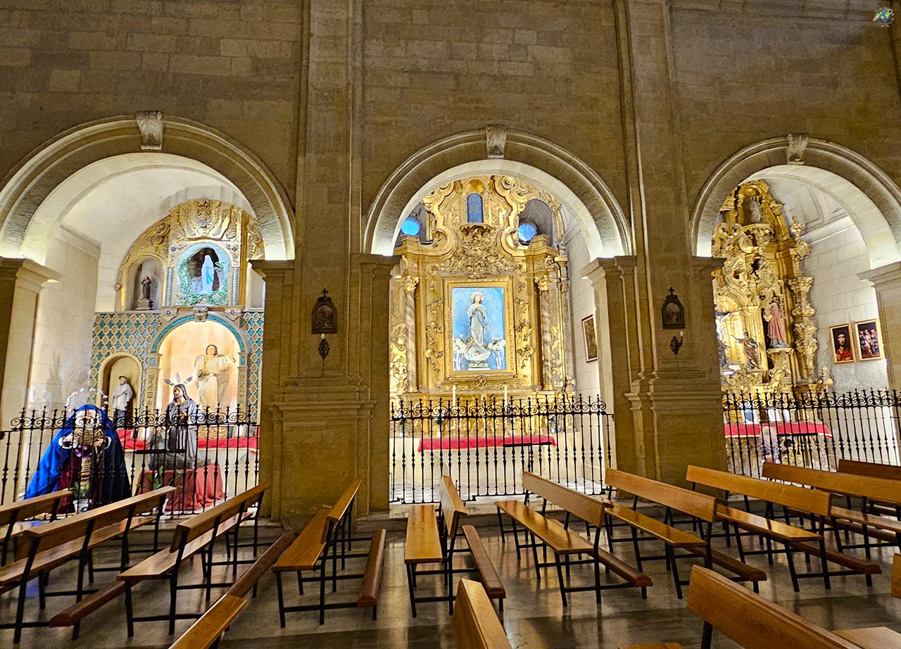 A nivel arquitectónico, la iglesia responde principalmente al estilo renacentista, algo que se aprecia tanto en su equilibrio como en la sensación de orden que transmite. Sin embargo, esa torre que se eleva junto a la fachada introduce un contraste interesante, ya que pertenece a una etapa posterior y presenta rasgos barrocos. En el interior, el espacio se organiza en forma de cruz latina, con una nave amplia cubierta por una gran bóveda que, aunque es de ladrillo, está trabajada de forma que simula piedra. A lo largo de los laterales se abren pequeñas capillas que conservan retablos barrocos y diferentes piezas artísticas, lo que aporta riqueza al conjunto. Pero si hay una imagen especialmente importante aquí es la de la Virgen de las Mercedes, patrona de Alcalá la Real. Su historia está muy arraigada en la tradición local y su devoción se remonta siglos atrás. La talla actual, realizada tras la Guerra Civil para sustituir a la original, representa a la Virgen con el Niño en brazos, con una estética delicada y muy reconocible para los alcalaínos.