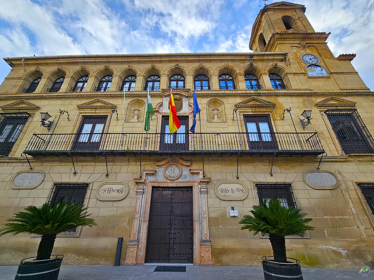 El Ayuntamiento de Alcalá la Real es uno de esos edificios que, sin necesidad de grandes dimensiones, consigue llamar la atención por su presencia y por el papel que ha tenido en la vida de la ciudad. Su construcción se remonta a 1733 y no se entiende sin el conjunto del que forma parte. En ese momento también se ordenó la plaza y las conocidas como Casas de Enfrente, creando un espacio amplio, abierto y con una estética muy equilibrada que todavía hoy se percibe al pasear por la zona. El edificio se levantó en poco más de un año y medio y presenta una estructura muy proporcionada, organizada en tres niveles y marcada por una clara simetría. Su estilo responde a un barroco con influencia clásica, algo que se aprecia especialmente en la fachada.