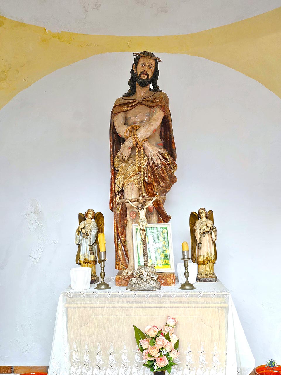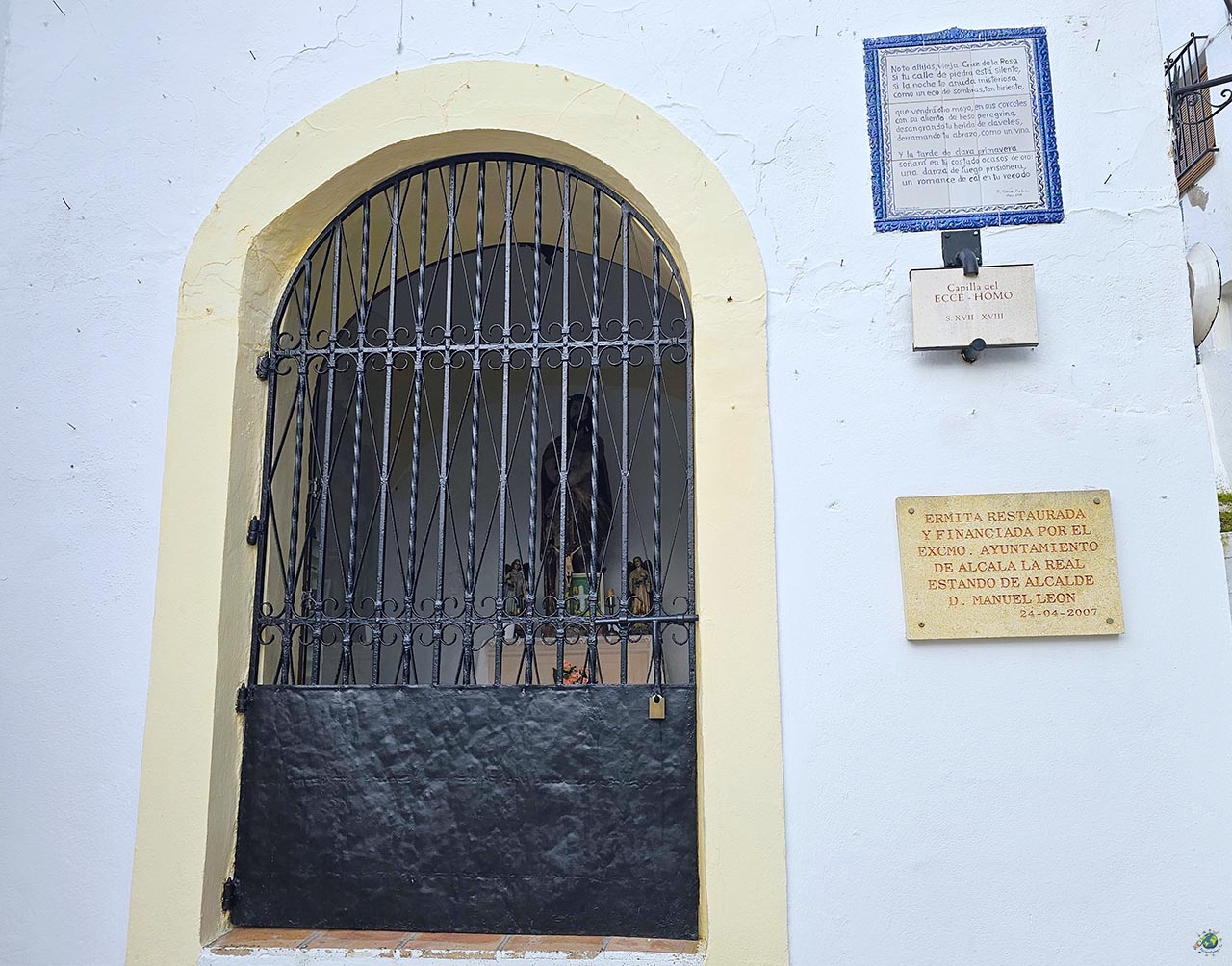 Entre los rincones que vas descubriendo al recorrer el barrio de las Cruces, hay uno que tiene un significado especial dentro de la tradición local: la Capilla del Ecce Homo. Este pequeño templo fue, en su origen, la primera estación del antiguo Calvario que los franciscanos del convento de la Consolación establecieron en el Cerro de las Cruces. Su construcción se remonta al siglo XVII, lo que explica ese aire sencillo pero cargado de historia que se percibe nada más llegar. En su interior se encuentra la imagen del Ecce Homo, una talla de escuela granadina que llegó a Alcalá la Real en el siglo XX para sustituir a la original, desaparecida durante la Guerra Civil. Desde entonces, se ha convertido en una de las imágenes más representativas de esta zona. El espacio es recogido, pero guarda algunos detalles interesantes, como el retablo de estilo neogótico sobre el que se sitúa la imagen o varias piezas que ayudan a contextualizar su valor devocional.