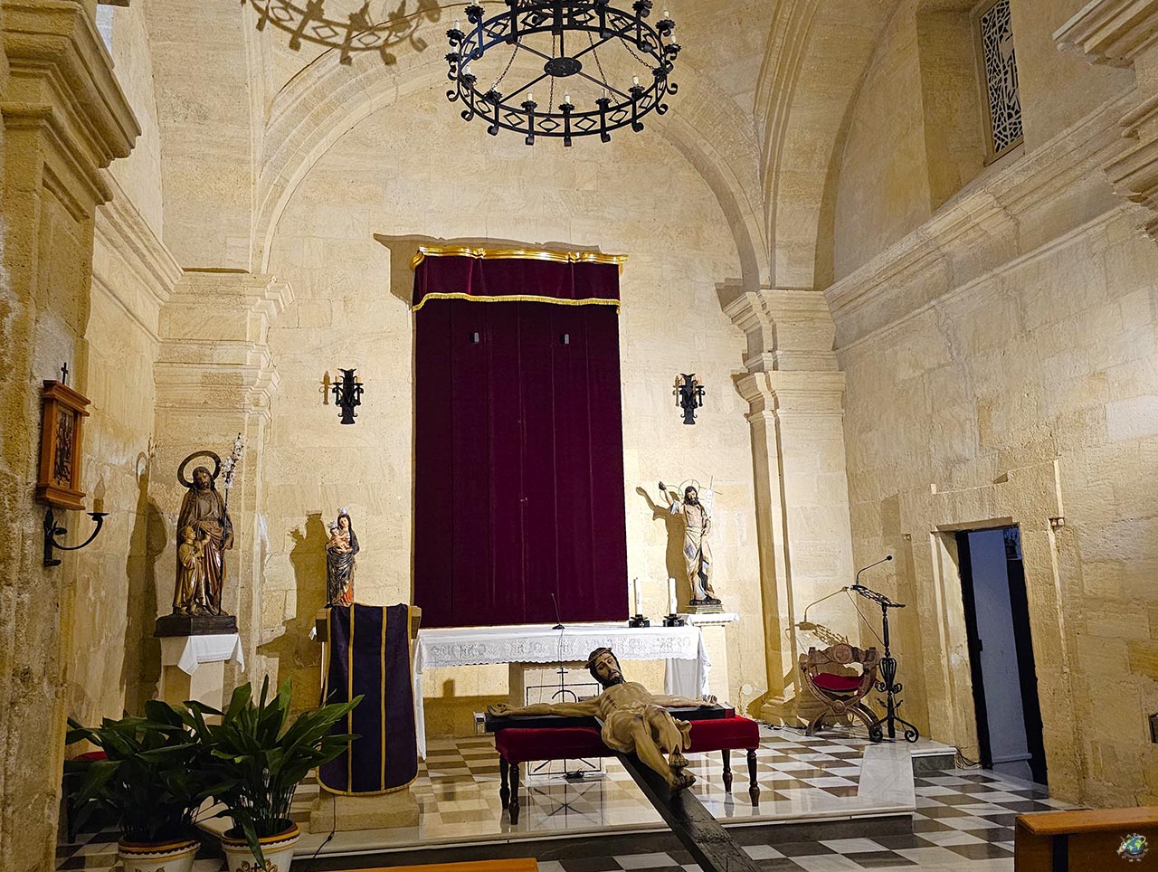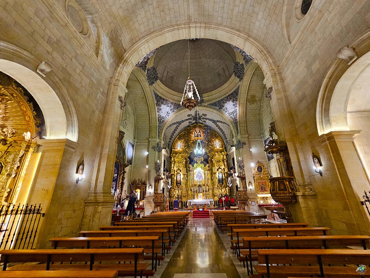 En el interior, el espacio sorprende por la calidad de su construcción. La bóveda de piedra, trabajada con gran precisión, y la cúpula con linterna generan un interesante juego de luces y sombras que cambia a lo largo del día. Además, la iglesia conserva elementos de gran valor, como un retablo dedicado a Santo Domingo de Silos, patrón de Alcalá la Real, y diversas piezas procedentes de la antigua parroquia que llevó su nombre. Entre ellas destaca la pila bautismal, un elemento con mucha carga simbólica, ya que en ella fueron bautizados personajes tan importantes como Martínez Montañés o Pablo de Rojas. La imagen actual de la Virgen de las Angustias, muy vinculada a la tradición local, sustituye a la original, que se perdió en el siglo XX.