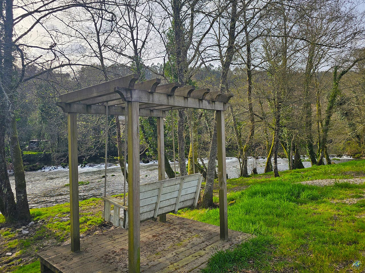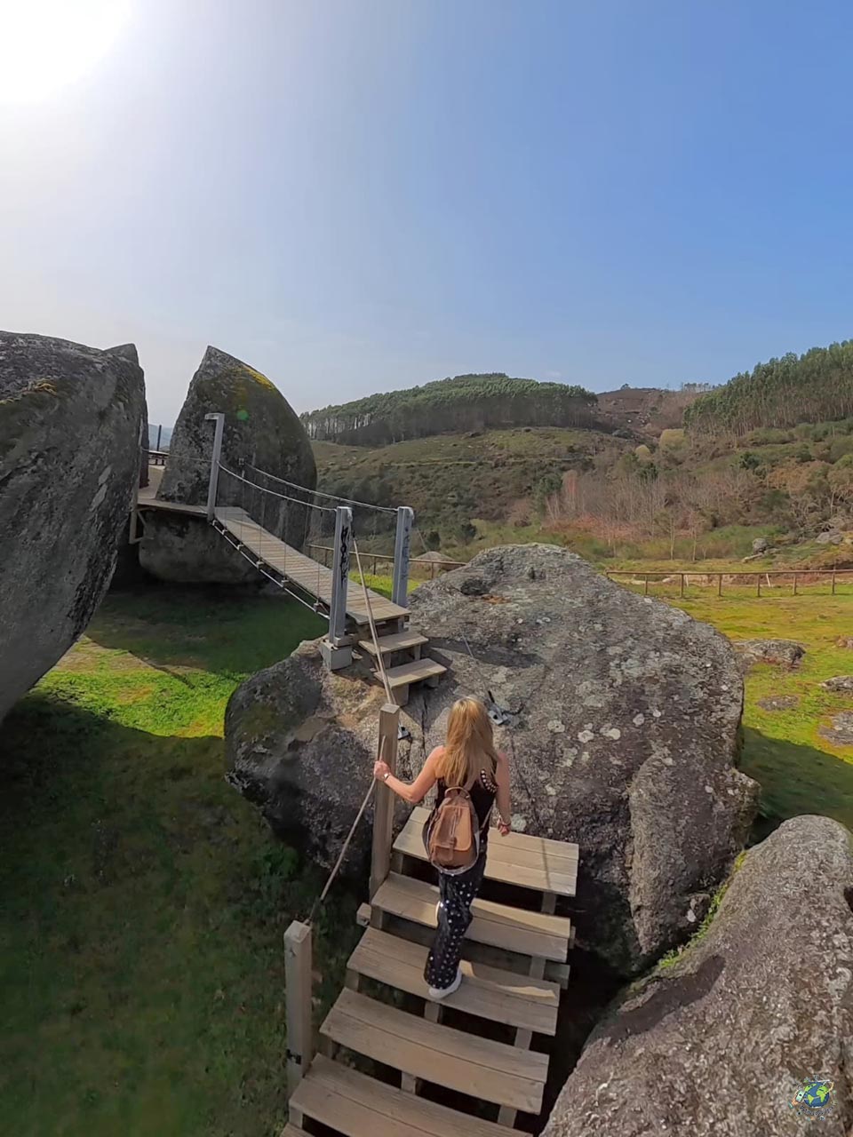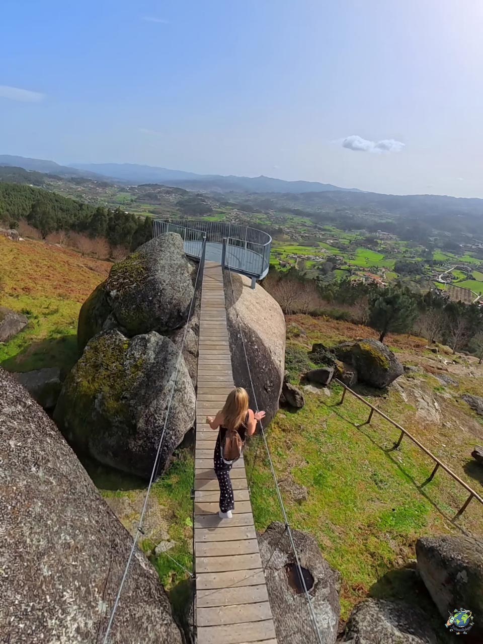 Cuando visitamos Sistelo tambien nos acercamos al Baloiço de Penouços, un rincón menos conocido pero con mucho encanto. Aquí el protagonista es un columpio gigante con vistas abiertas al entorno, perfecto para disfrutar del paisaje de una forma distinta. Además, hay otro columpio más pequeño pensado para los peques, así que es una parada que también encaja muy bien si viajas en familia. El lugar no se queda solo en eso. Para llegar al mirador principal hay que cruzar dos pequeños puentes colgantes, lo que le añade un punto de aventura. También encontrarás una pasarela que atraviesa una gran roca y una pequeña laguna que completa el paisaje, creando un entorno muy bonito y bastante tranquilo. Otro punto a favor es lo fácil que resulta visitarlo, ya que se puede llegar en coche prácticamente hasta el propio acceso y hay espacio para aparcar justo al lado.