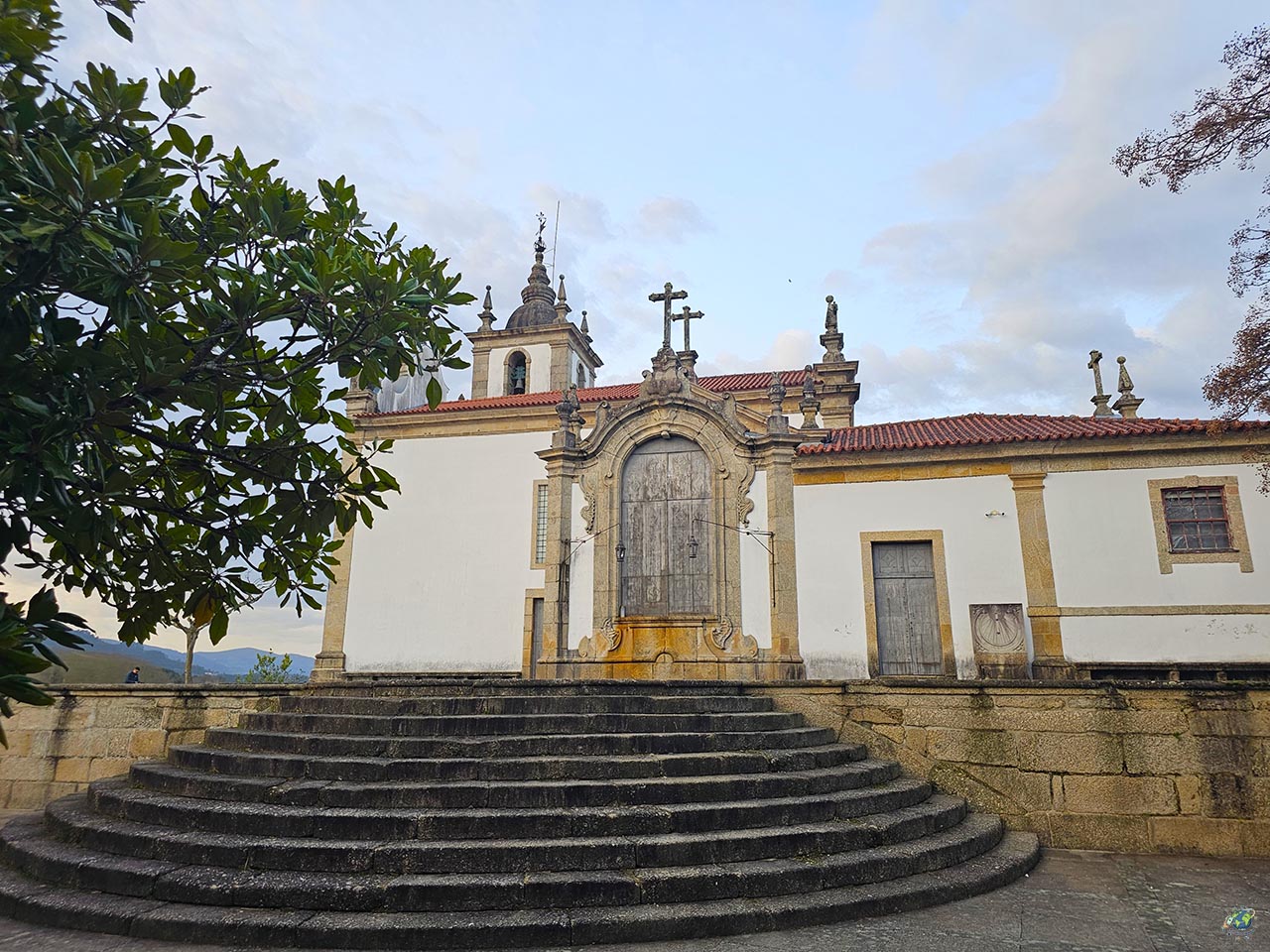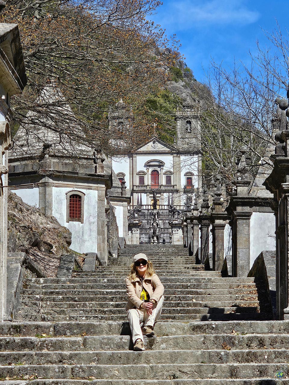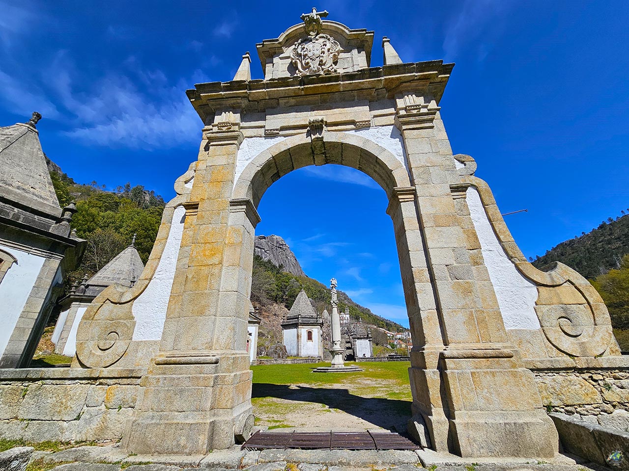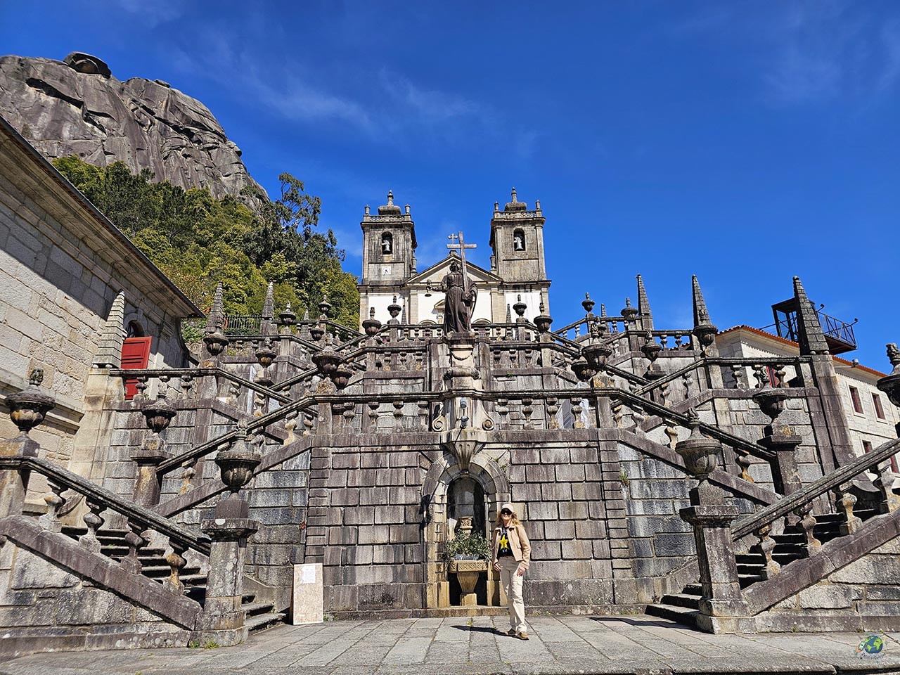 Otro de los lugares que merece mucho la pena visitar en los alrededores de Arcos de Valdevez es el Santuario de Nuestra Señora de la Peneda, un rincón donde paisaje y espiritualidad van de la mano. El santuario se encuentra encajado en un valle rodeado de naturaleza, con un gran macizo rocoso como telón de fondo y vegetación que le da un ambiente muy especial. Es un lugar que transmite tranquilidad nada más llegar, y no es casualidad que cada año reciba a numerosos peregrinos que buscan aquí un momento de calma. El conjunto fue construido entre finales del siglo XVIII y el XIX, y uno de sus elementos más característicos es la gran escalinata que conduce hasta la iglesia. A medida que se asciende, aparecen pequeñas capillas que representan distintas escenas religiosas, acompañando el recorrido paso a paso. En uno de los descansos se abre una plaza circular con una fuente central, que marca uno de los puntos más llamativos del conjunto. Ya en la parte superior, antes de acceder al templo, llaman la atención las esculturas que representan las virtudes, aportando un carácter simbólico a todo el recorrido. Nosotros nos quedamos sin ver el interior porque cuando lo visitamos a finales de marzo 2026 estaba en obras.