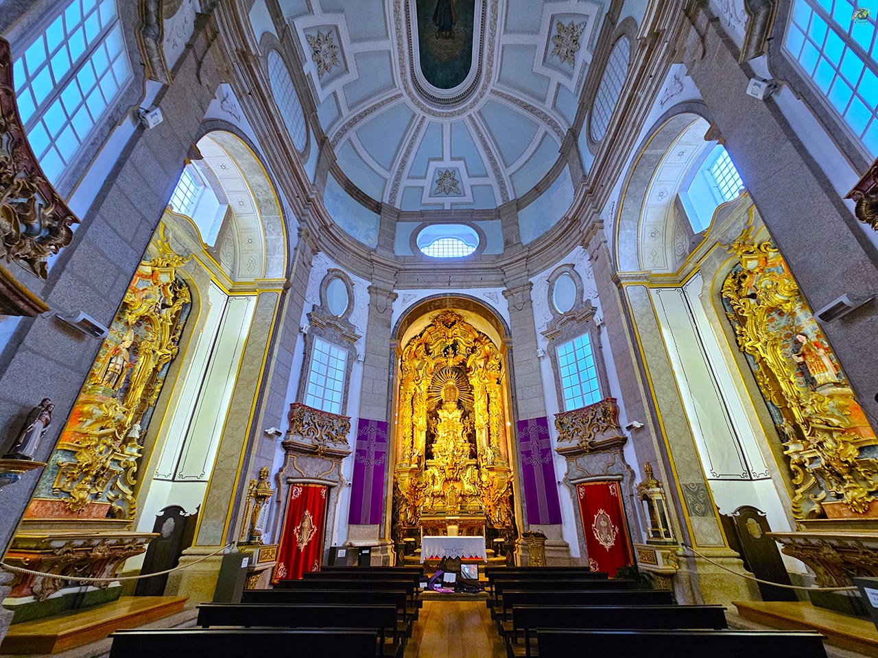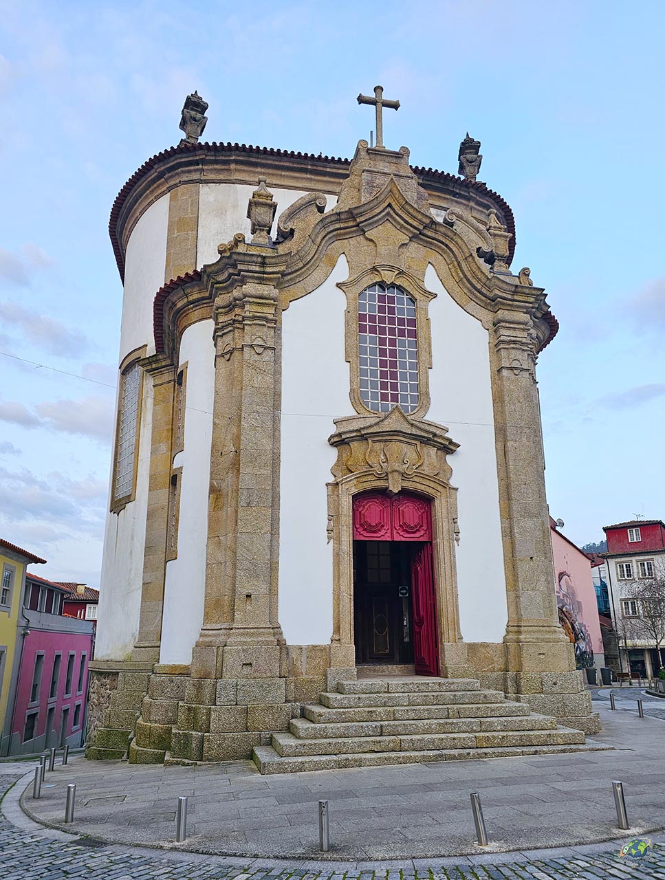 En una de las zonas más animadas de Arcos de Valdevez se encuentra la Igreja de Nossa Senhora da Lapa, un templo que no pasa desapercibido, tanto por su ubicación como por su arquitectura. De hecho, la plaza en la que se sitúa toma su nombre de esta iglesia, lo que da una idea de su importancia dentro de la vida local. Construida en el siglo XVIII bajo la dirección del arquitecto bracarense André Soares, es uno de los mejores ejemplos del barroco en la villa, con claros matices rococó en su interior. Lo primero que sorprende al verla es la forma de su nave, con una estructura de planta ligeramente ovalada y una altura considerable que rompe con la estética más habitual de otros templos de la zona. Este volumen contrasta con las partes más bajas y rectilíneas del vestíbulo y la capilla mayor, creando un conjunto arquitectónico muy dinámico. La fachada, trabajada en piedra, presenta una portada enmarcada y decorada, rematada por ventanas que aportan luz al interior. Sin embargo, es al entrar cuando realmente se aprecia la riqueza del edificio. Destacan los retablos de talla dorada, que contrastan con la claridad de los estucos, generando un juego visual muy característico del estilo rococó.