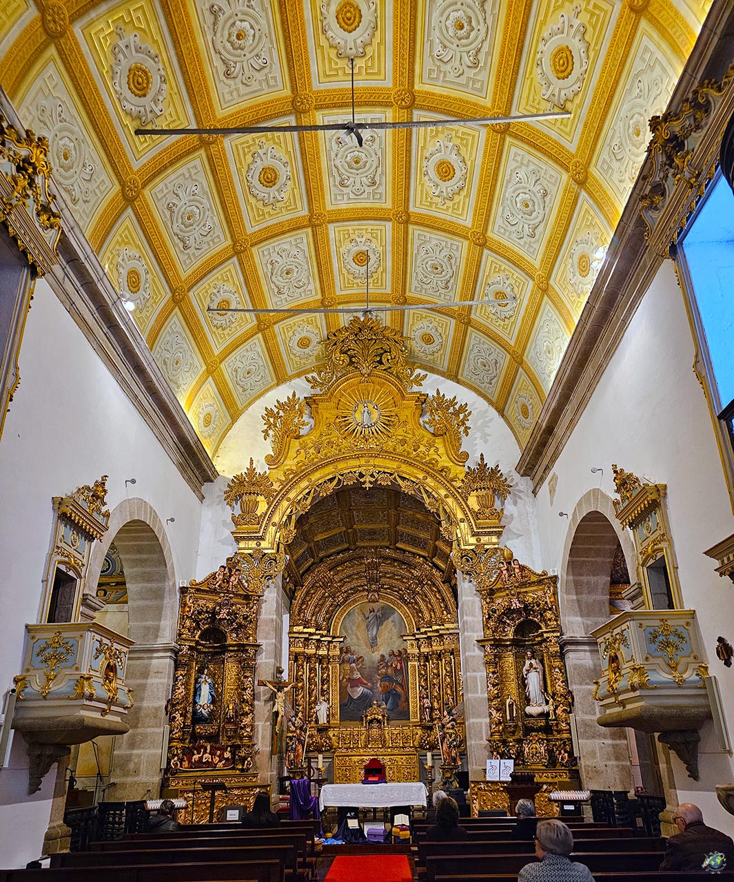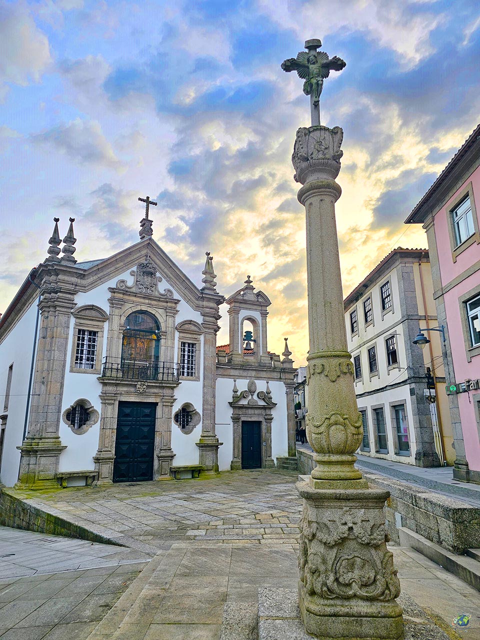 En uno de los puntos donde confluyen varias calles de la villa, la Iglesia de la Misericordia aparece integrada en una pequeña plaza empedrada que le da protagonismo sin necesidad de grandes dimensiones. Es un rincón con bastante encanto, donde además destaca un cruceiro , en el espacio que antiguamente ocupaba el cementerio de la hermandad. Uno de los elementos más llamativos es el cruceiro exterior, una obra de piedra muy trabajada, con relieves que representan escenas religiosas y que merece la pena observar por el nivel de detalle que presenta. El origen de este templo está ligado a la creación, a finales del siglo XVI, de la Cofradía de la Misericordia, una institución clave en la vida de la época. Su labor iba mucho más allá de lo religioso, ya que se encargaba de ayudar a los más necesitados, enfermos o presos, algo muy habitual en este tipo de hermandades en Portugal. A lo largo de los siglos, el edificio fue evolucionando, lo que explica la mezcla de estilos que se aprecia hoy en día. La fachada mantiene una línea bastante equilibrada, con un acceso principal decorado y una hornacina que aporta un toque más ornamental. Al entrar, el espacio sorprende por su nivel de detalle. Aunque se trata de una nave única, conserva elementos decorativos interesantes como pinturas con motivos vegetales, trabajos en estuco y retablos que combinan madera tallada y dorada. A esto se suman piezas como el púlpito o el coro, que completan el conjunto.