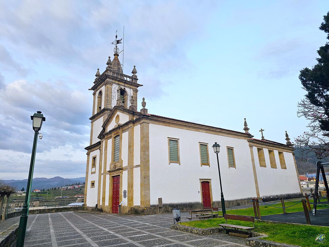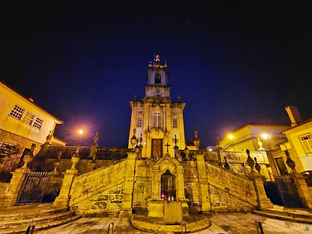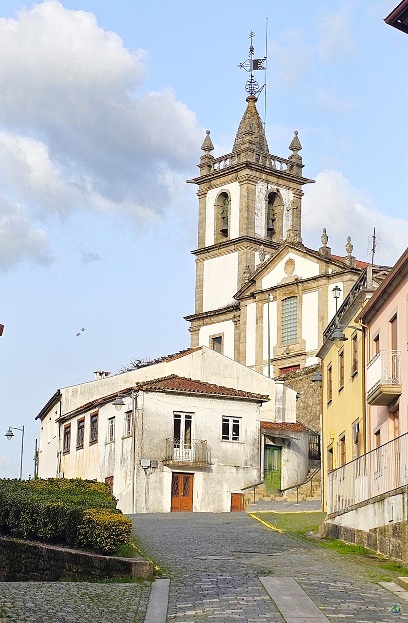 El templo actual fue construido entre los siglos XVIII y XIX para sustituir a una iglesia anterior, reflejando la evolución histórica de la localidad. Presenta un marcado estilo neoclásico, visible en su fachada de piedra, sobria y elegante, que transmite una sensación de solidez característica de la arquitectura religiosa portuguesa de la época. Uno de los elementos más llamativos es su escalinata principal, que eleva el acceso al templo y le aporta un aire monumental. Sobre ella se alza la torre campanario, integrada en la fachada, que además de albergar las campanas incorpora un reloj añadido en 1946, convirtiéndose desde entonces en un punto de referencia para la vida cotidiana del municipio. En el interior, predominan las líneas sencillas, aunque con detalles que enriquecen el conjunto. Destacan los altares de talla dorada, algunas pinturas decorativas en los techos y elementos de azulejería incorporados posteriormente. Las capillas laterales albergan diferentes imágenes religiosas, mientras que los púlpitos de piedra reflejan el cuidado por el detalle escultórico. Nosotros la vimos ya por la noche y no se aprecian los colores del azulejo de la fachada, te recomiendo ir durante el día que es más bonita.