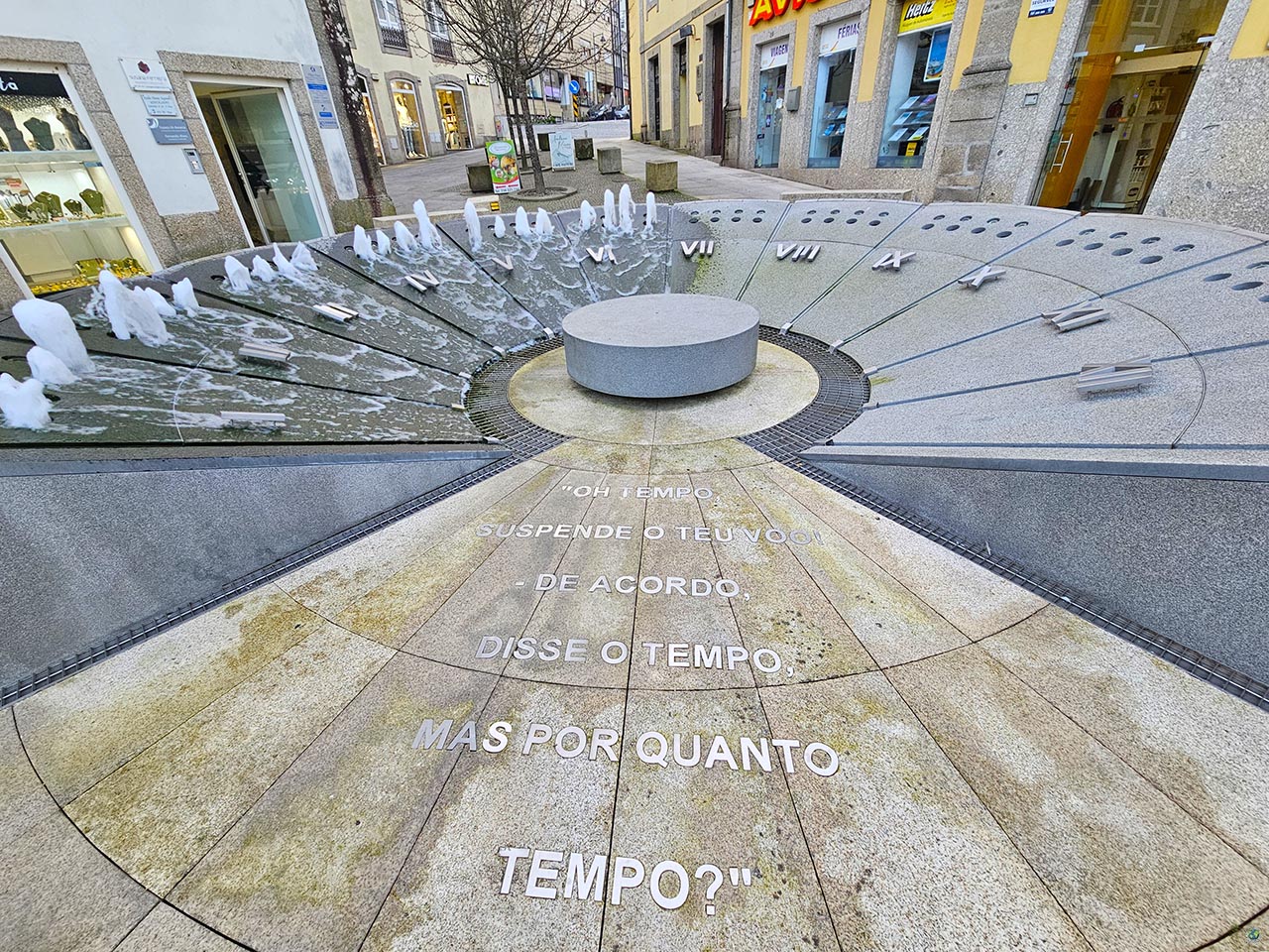En el Largo da Lapa se encuentra uno de los rincones más originales de Arcos de Valdevez: el Reloj de Agua. A primera vista parece una fuente más, pero en realidad es un elemento muy curioso que combina diseño y funcionalidad de una forma bastante sorprendente. En lugar de agujas, aquí es el agua la que marca el paso del tiempo. El sistema está formado por varios chorros verticales que indican los intervalos de 15 minutos, creando una especie de reloj visual en el que cada bloque corresponde a una hora. El agua va descendiendo por planos inclinados hasta recogerse en la parte inferior, funcionando todo en un circuito cerrado. Cuando cae la noche, el conjunto gana aún más protagonismo gracias a la iluminación, que resalta los números del reloj y le da un aspecto diferente según la intensidad de la luz. Pero más allá de lo visual, este espacio también tiene un punto reflexivo. Junto a la fuente se puede leer una inscripción del pensador francés Marc Augé: