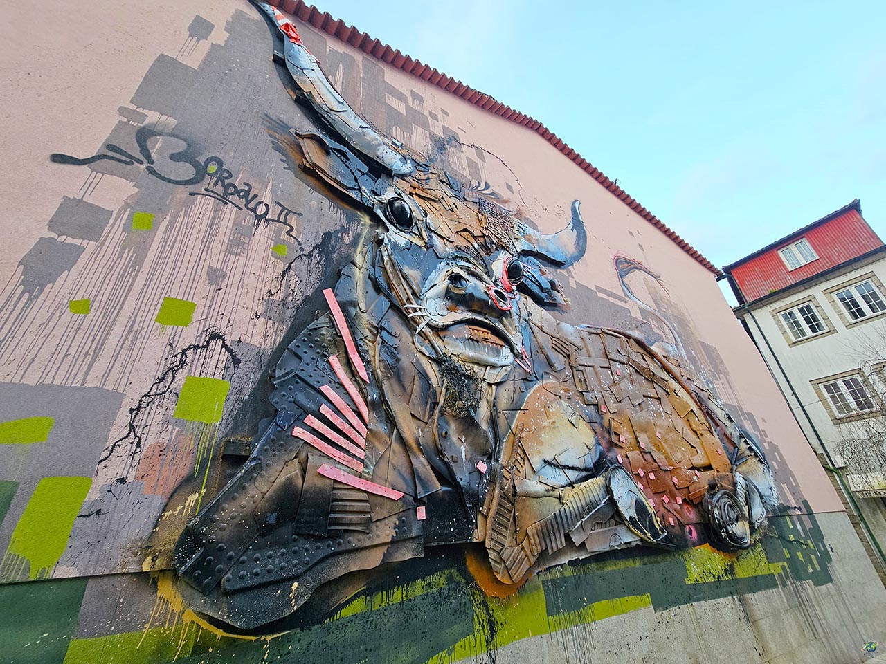 Más allá de su patrimonio histórico, Arcos de Valdevez también sorprende con pequeños detalles de arte urbano que conectan directamente con la identidad del lugar. Casi al lado de la Iglesia da Lapa puedes encontrar uno de los más llamativos ,es el mural del artista lisboeta Bordalo II, situado en la pared lateral del restaurante “A Regional”, en pleno centro histórico. La obra representa una vaca cachena, una de las razas más características de la zona, y lo hace utilizando materiales reciclados. Es precisamente esa la esencia de su trabajo: transformar residuos en arte para lanzar un mensaje claro sobre el consumo y el impacto ambiental. Lo curioso es que esta pieza, creada a partir de “basura”, se encuentra junto a contenedores de reciclaje, reforzando aún más esa idea de reutilización y conciencia ecológica. Una obra que no solo llama la atención visualmente, sino que también invita a reflexionar.