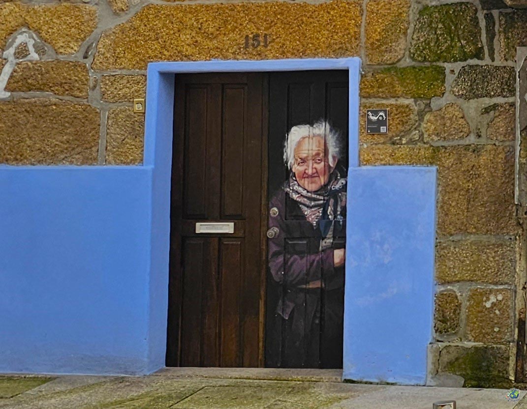 Muy cerca, en el Largo da Valeta, se encuentra otro mural completamente diferente, pero igual de especial. En este caso, la protagonista es Lininha, una vecina muy querida en la villa que llegó a cumplir 101 años. La artista Daniela Guerreiro la retrató sonriente en la puerta de su casa, como si siguiera formando parte del día a día del barrio. Esta obra, creada dentro del festival MurArcos, tiene un carácter mucho más emocional y cercano, y es un bonito homenaje a la memoria local. Pero hay muchos murales mas en Arcos de Valdevez, Puedes verlos todos en este enlace